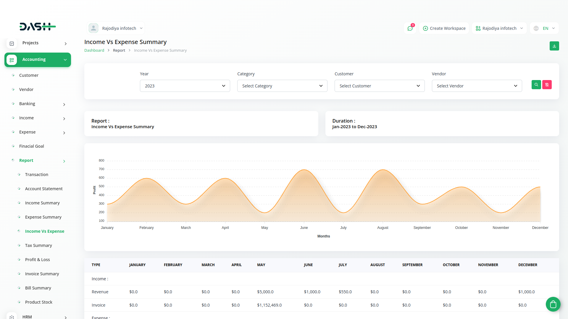 A budget is a financial plan for a specified period to keep in check with the working capital. This feature here helps to maintain the capital flow. You can set monthly, quarterly, half-yearly, or yearly budgets according to your business plans and needs. The main categories are “Income” and “Expense” where one can edit /update /delete the sub-categories as well.